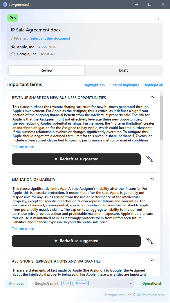 Lawgmented helps you review contracts by highlighting what matters, explaining it in plain language, and giving clean redrafts tailored to your side of the deal – right in your Word document.